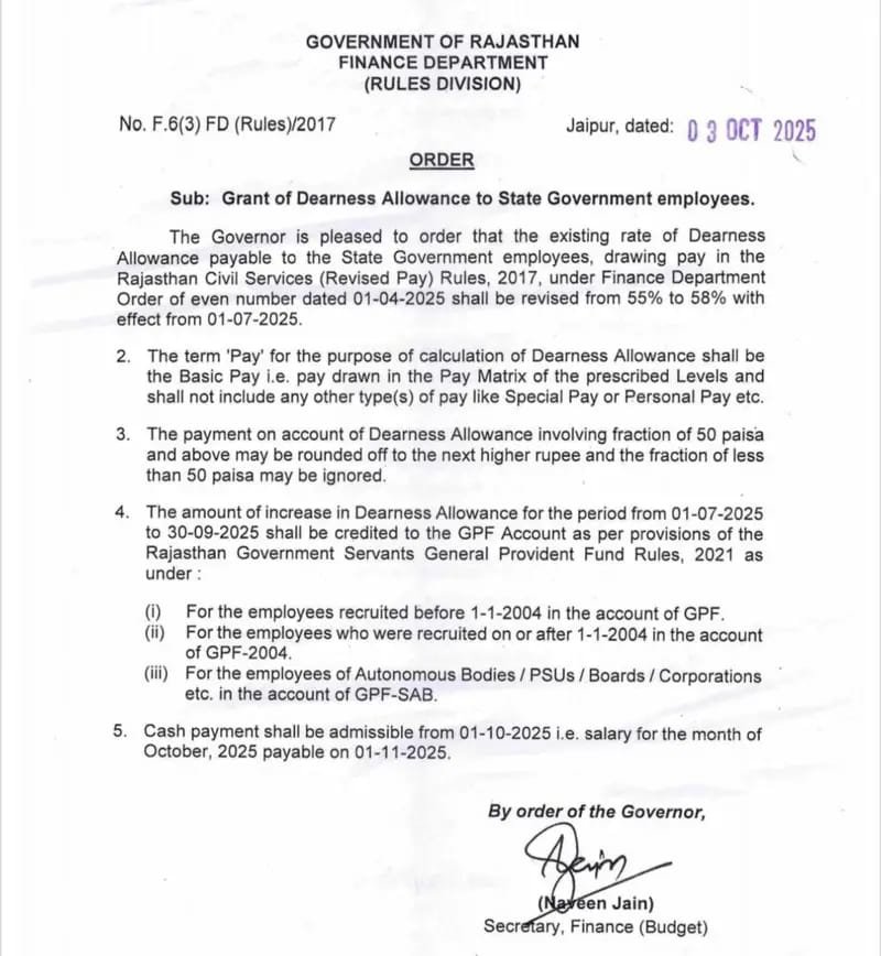 DA Hike Big News: राजस्थान सरकार के द्वारा राजकीय लाखों कर्मचारियों को दिवाली से पहले काफी बड़ा सौगात दिया गया है। सरकार के द्वारा महंगाई भत्ता में बढ़ोतरी का निर्णय ले लिया गया है वित्त विभाग के द्वारा इस सम्बन्ध में आदेश घोषित कर दिया गया है। नई दर 1 जुलाई 2025 से लागू होने जा रही है सरकार के आधार पर महंगाई भत्ते की गणना अब बेसिक सैलरी के आधार पर किया जाएगा जिससे लंबे समय से इंतजार कर रहे कर्मचारियों को काफी बड़ी राहत प्रदान होगी।