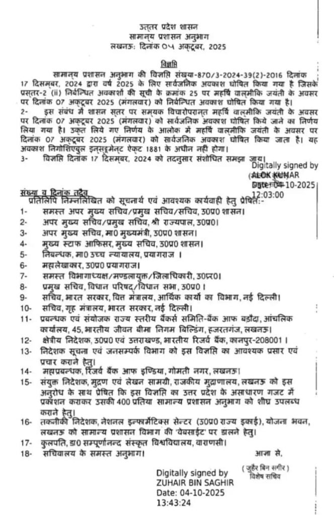 Public Holiday: इस बार यूपी के लोगों हेतु अक्टूबर का महीना काफी खुशियों से भरा रहने वाला है। मुख्यमंत्री योगी आदित्यनाथ के द्वारा अक्टूबर 2025 को पूरे प्रदेश में सार्वजनिक छुट्टियों का ऐलान कर दिया है। क्योंकि इस दिन सभी स्कूल कॉलेज व सरकारी दफ्तर व आने शैक्षिक संस्थान बंद रहने वाले हैं। त्योहारों की इस मौसम को देखा जाए तो छात्रों को सूचकांक कर्मचारियों को परिवारों के साथ समय बिताने में पूजा पाठ करने व आराम करने हेतु काफी अच्छा अवसर मिल चुका है।
