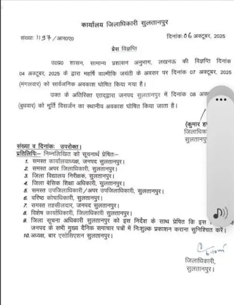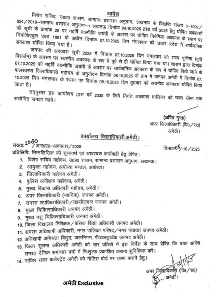जिलाधिकारी कार्यालय से जारी हुई अधिसूचना के मुताबिक छुट्टी में महत्वपूर्ण बदलाव कर दिया गया है। सुल्तानपुर अमेठी के जो जिलाधिकारी है कार्यालय से जारी अधिसूचना के दौरान यह कहा गया है कि महर्षि वाल्मीकि जयंती पर पहले 7 अक्टूबर को सार्वजनिक छुट्टियां घोषित किया गया था।अभी छुट्टी को 8 अक्टूबर को स्थानीय अवकाश यहां पर घोषित किया गया है जितने भी सरकारी कार्यालय विद्यालय शिक्षण संस्थान है इनको निर्देशित किया गया है कि 8 अक्टूबर को पूरी तरीके से बंद रहने वाले हैं। धार्मिक व सांस्कृतिक आयोजन महर्षि वाल्मीकि जयंती हिंदू वर्ष के महान कवि और रामायण के रचयिता महान शिवांगी जयंती के रूप में हर बार धूमधाम से यहां पर मनाया जाता है। इस दिन प्रदेश में धार्मिक व सांस्कृतिक कार्यक्रम का आयोजन होता है। अब विद्यालय में अवकाश के बदलाव के बाद जितने भी कार्यक्रम है 8 अक्टूबर को आयोजित किया जाने वाला है।
